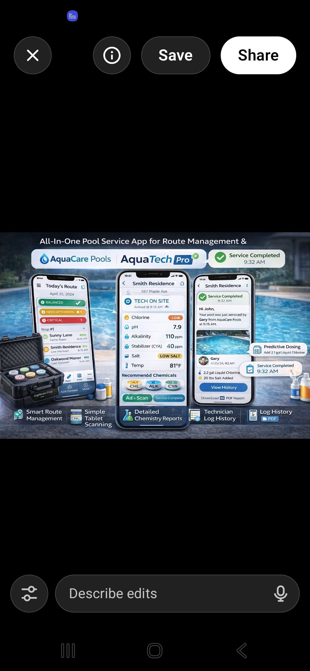 The AquaNeX device will load pool service jobs from the app, guide the technician through each visit step by step, display and record water test readings, help with chemical dosing decisions. The app also keeps track of chemicals in the truck or warehouses. When chemicals get low before you start your route the app will tell you what chemicals are low and what to get. The app will also remind the tech of any items needed for the day as well. The device and app also tell you of alret risks. Like pool at risk of scaling or alge risk, and metals in water. Log service tasks and chemicals added, save visit data, and sync completed job information back to the phone app through Bluetooth. It is designed to be the primary tool used at the pool during the service visit.